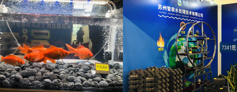 本次展会,我司陈列了4种新型生物质炭材料:颗粒性生物质炭填料、生态透水模块、生物质炭膜架、生物质炭鱼礁。所展产品均为市场上新型水处理材料,其科学的设计形态及新颖的处理模式,吸引了很多水处理行业的专家及教授前来了解,并得到了相关专家的认可。我司为了方便客户更直观的了解产品属性,将产品放入鱼缸作为处理养殖水的材料,展现出一个小型生态鱼池。